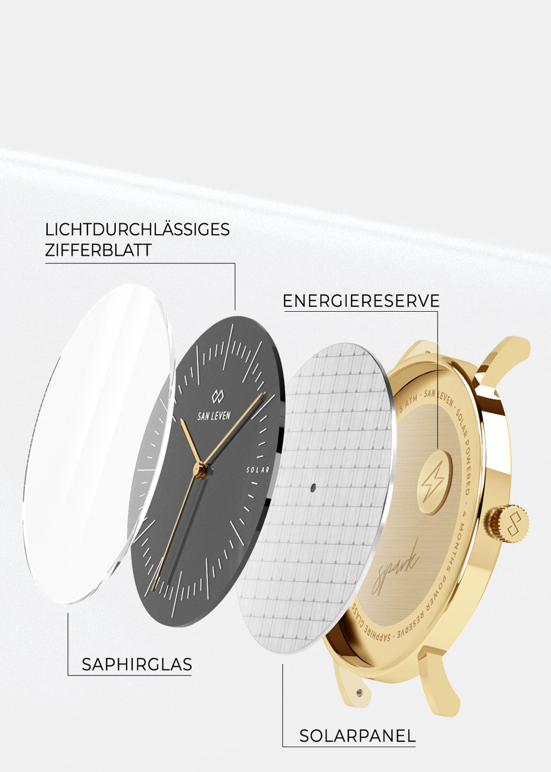 Das Herz der SPARK ist ein Solaruhrwerk, das sich mühelos durch natürliches und künstliches Licht auflädt. Das Solarpanel bleibt hierbei hinter dem Zifferblatt verborgen, was diesen Vorgang nahezu magisch macht. Die gewonnene Energie wird in einer wiederaufladbaren Energiereserve gespeichert, damit deine SPARK auch ohne Licht bis zu 4 Monate auskommt. Der regelmäßige Batteriewechsel entfällt damit, was nicht nur weniger Batteriemüll bedeutet, sondern auch weniger Stress und Kosten für dich.